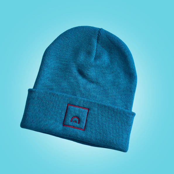 Soft, warm winter hat in blue with red Horizont logo stitching.